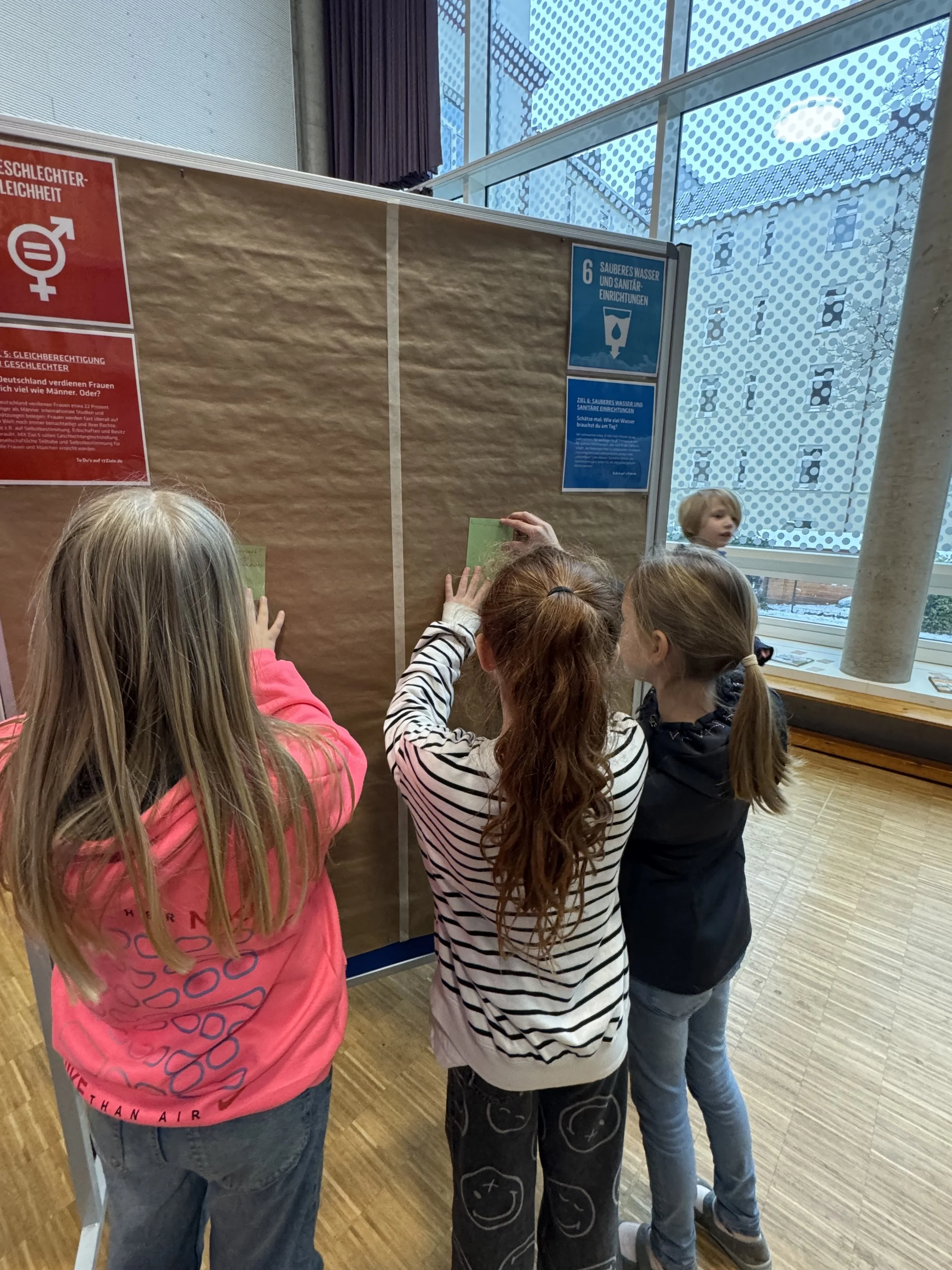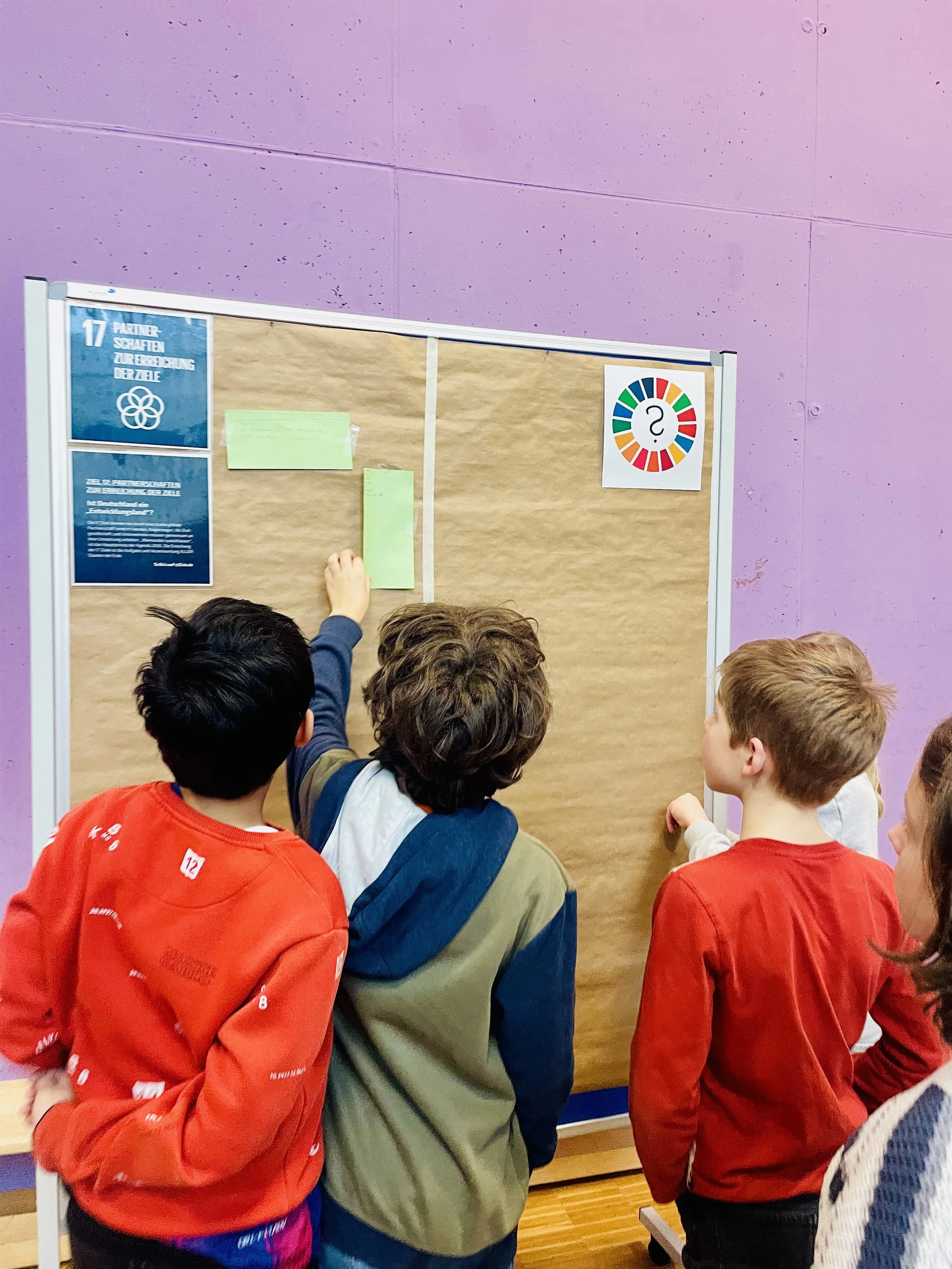 Den Auftakt bildete eine Begrüßung von Frau Reider, gefolgt von einem Vortrag in der Aula, bei dem Jens Becker einen ersten Impuls setzte. So auf die Projektphase eingestimmt, legten die Kinder in der dritten und vierten Stunde mit ihrer Planung los: Einige hatten sofort Ideen, andere nutzten die Angebote mit Büchern und Gesprächen mit den Lehrkräften, um aus ersten Einfällen konkrete Ideen werden zu lassen. Die Energie, die im dritten Stockwerk des Schulgebäudes herrschte, war ansteckend und elektrisierend. In der letzten Stunde ordneten die Kinder ihre Projektideen wieder in der Aula einem der 17 Ziele der BNE zu und reflektierten den Tag im Klassenverband. Dabei konnten alle von Highlights berichten, die sie im Laufe des Tages erlebt hatten.