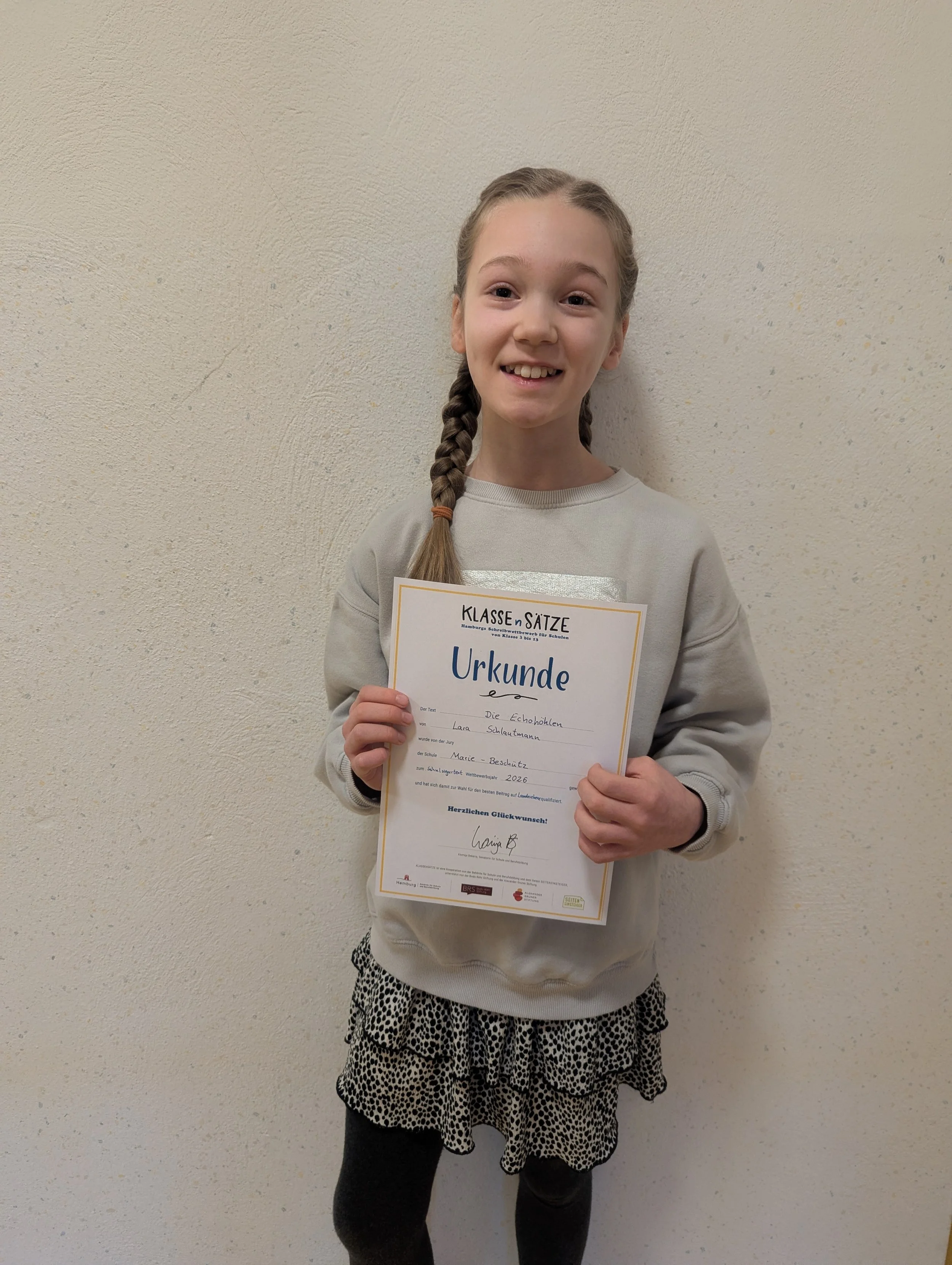 Für Lara wird es nun spannend. Sie wird unsere Schule beim hamburgweiten Finale des Wettbewerbs „Klassensätze“ im Ernst-Deutsch-Theater vertreten. Wir drücken alle Daumen, wenn es bald heißt: Bühne frei für die besten Nachwuchs-Autoren der Stadt!