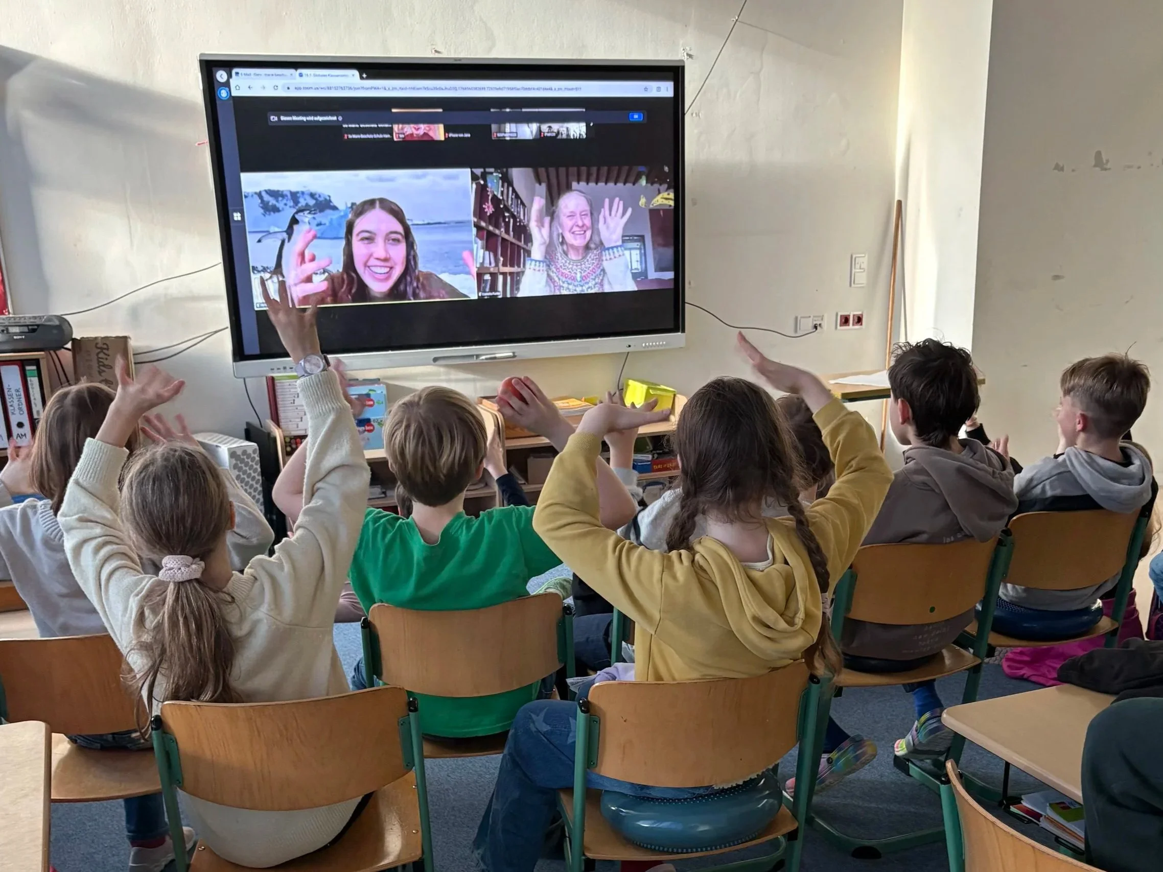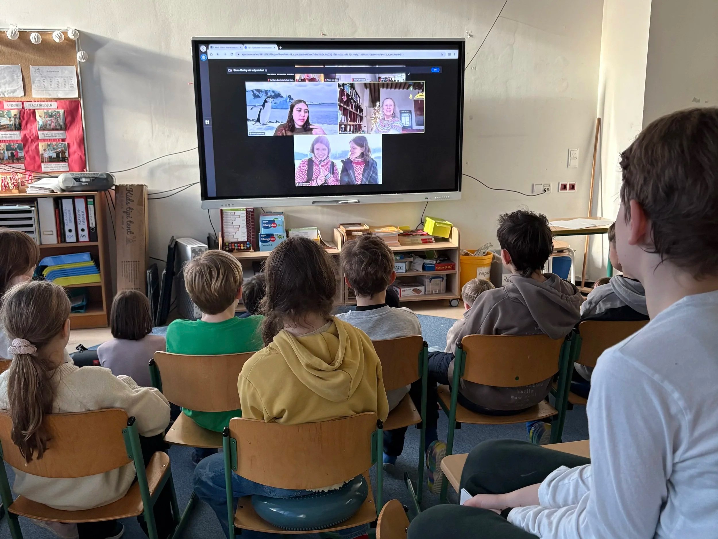 Am Freitag, den 16.01.2026 durfte die Klasse 3a eine ganz besondere Schulstunde erleben: Gemeinsam mit mehr als 1000 Klassen aus ganz Deutschland nahmen die Schüler*innen per Videokonferenz an einer Live-Unterrichtsstunde direkt von einem Forschungsschiff in der Antarktis teil. Klimaaktivistin Luisa Neubauer und Ozeanforscherin Lea Wowra führten die Zuschauer*innen über die "Melizia Explorer" und zeigten uns ihren Ausblick vom Schiff - das Pinguin-Postamt, das von einer ganzen Menge Eselspinguine bewohnt wird.